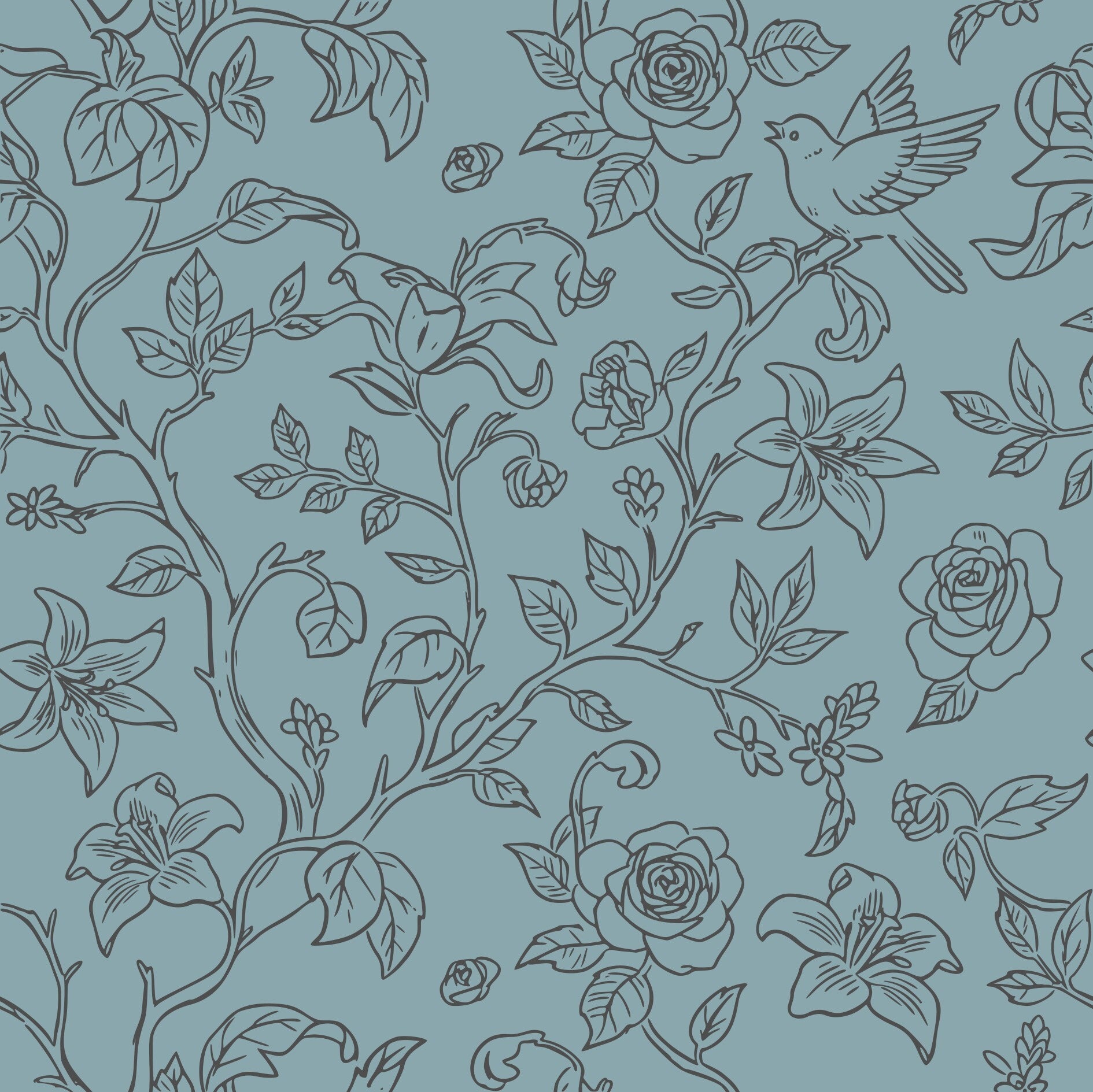 This elegant wallpaper features a serene blue background adorned with delicate, hand-drawn floral branches that bring a touch of nature indoors. Perfect for any room. Charming blooming roses, lilies and a songbird among the leaves. A touch of calm in a modern aesthetic.